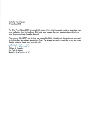 This Colt 1903 Pocket auto pistol was presented to U.S. Military Academy cadet Clark Porter Chandler II on the occasion of his graduation from West Point, U.S.M.A. class of 1960, by classmates of his father, Col. William E Chandler, U.S.M.A. class of 1931.