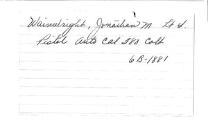 This Colt Model 1908 .380 U.S. Property marked "General Officer's Pistol" is documented as having been issued to General Jonathan Mayhew Wainwright. Some may remember General "Skinny" Wainwright as being the unfortunate American commander left with the task of defending the doomed Philippine islands against overwhelming Japanese forces following the departure of "I shall return!" MacArthur. The story of Wainwright's defense of Bataan and the island fortress of Corregidor is truly inspiring. Wainwright galvanized his troops to fight on against the Japanese for over four months despite constant bombardment, starvation rations, and lack of ammunition.