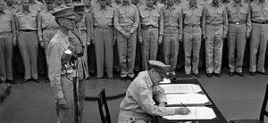 Wainwright held a place of honor aboard the USS Missouri in Tokyo Bay, standing directly behind General MacArthur, the Supreme Allied Commander, as he signed the instruments of the Japanese surrender. Upon his return State-side Wainwright experienced the Country's gratitude first hand with a ticker-tape parade through New York City attended by 4-million people strong!