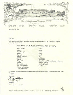 This Colt 1908 Pocket Hammerless was shipped to the Blish, Mize & Sillman Hardware Co. of Atchison, Kansas on October 27th, 1920. This example is factory Nickel finish with factory pearl grips with deep dish medallions.
