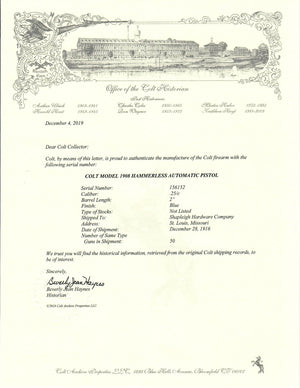 This Colt 1908 Vest Pocket was shipped to the Shapleigh Hardware Company in St. Louis, Missouri on December, 28th, 1916 in a 50 gun shipment.