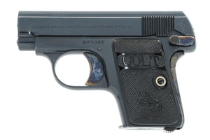 This Colt 1908 Vest Pocket features Colt's post war tank blued finish. It's noticeably darker then the Colt Pre-War fine brush blued finish. This pistol has a pair of square top hard rubber grips with a nickel grip screw. The trigger, grip safety and thumb safety are case colored. The slide has a single line address on the left hand side.