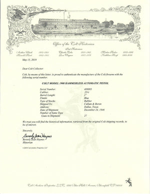 This Colt 1908 Vest Pocket was shipped to Cullum & Boren of Dallas, Texas on December 24th, 1946 in a 27 gun shipment. This Colt is near the end it's production run and appears they went back and utilized leftover parts to finish them up.