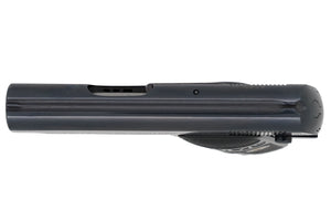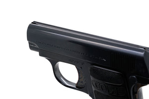 This Colt 1908 Vest Pocket features Colt's post war tank blued finish.  It's noticeably darker then the Colt Pre-War fine brush blued finish.  This pistol has a pair of square top hard rubber grips with a nickel grip screw.  Note the ramped front sight and the smooth sighting groove.  It might be interesting to note that the earliest Vest pockets used this identical sighing groove and front sight design.  The trigger and grip safety are case colored while the thumb safety is also tank blued.  The slide has a single line address on the left hand side.
