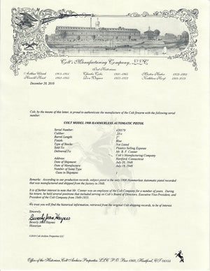 Extra remarks on the factory letter state:  According to our production records, subject pistol is the only 1908 Hammerless Automatic pistol recorded that was manufactured and shipped from the factory in 1948.