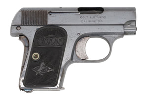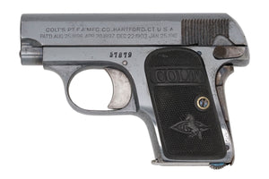 This Colt 1908 Vest Pocket features Colt's high polish blue finish and the early type 1 hard rubber grips. The trigger, thumb safety and grip safety are case colored while most other parts are fire blued.