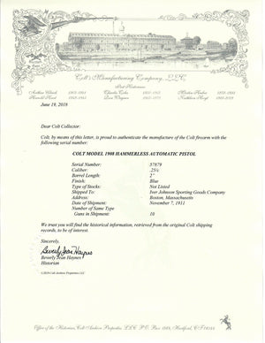 This pistol was shipped to the Iver Johnson Sporting Goods Company in Boston Massachusetts on November 7th, 1911 in a 10 gun shipment.