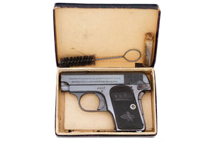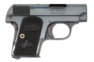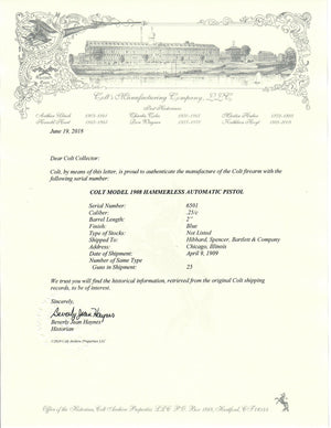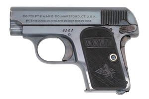 This Colt 1908 Vest Pocket was shipped to the Hibbard, Spencer, Bartlett & Company in Chicago, Illinois on April 9th, 1909 in a 25 gun shipment. It features Colts high polish blue finish with type 1 hard rubber grips. Trigger, thumb safety and grip safety are a dull case colored finish while other small parts are fire blue.