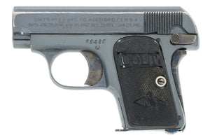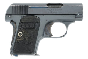 This Colt 1908 Vest Pocket features Colt's high polish blue finish and the early type 1 hard rubber grips. The trigger, thumb safety and grip safety are case colored while other parts are fire blued.