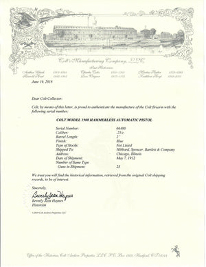 This Colt 1908 Vest Pocket was shipped to the Hibbard, Spencer, Bartlett & Company in Chicago, Illinois on May 7th, 1912 in a 25 gun shipment.
