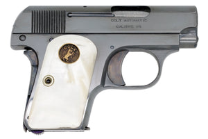 This Colt 1908 Vest pocket was built in 1913. It features Colt's high polish blue finish with round top deep dish pearl grips with forward facing medallions.