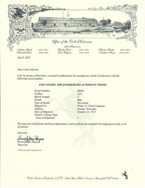 This pistol was shipped to the Walter G. Clark Company in Omaha, Nebraska on October 15th, 1913 in a 5 gun shipment.