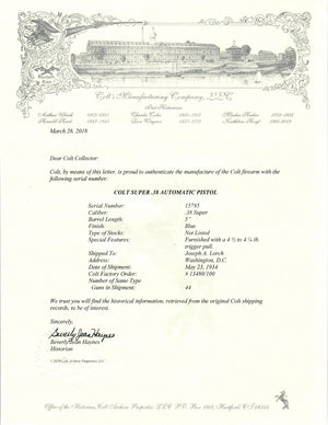 This Colt 38 Super shipped to Joseph A. Lorch in Washington D.C. on May 23rd, 1934 in a 44 gun shipment. Special features indicate that it was Furnished with a 4.5 to 4.75 lb. trigger pull.