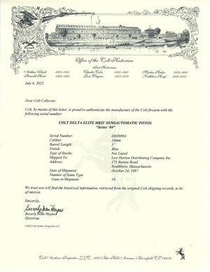 This Delta Elite was shipped to Lew Horton Distribution Company Inc. at 175 Boston Road, Southboro, Massachusetts on October 24th, 1987 in a 10 gun shipment.