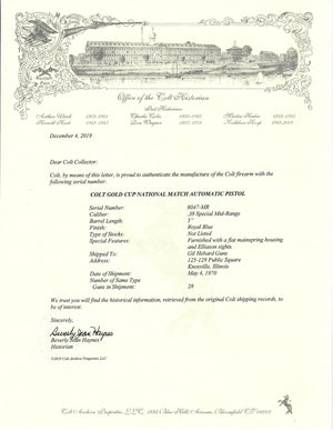 This Colt Gold Cup National Match .38 Special Mid-Range was shipped to Gil Herbard Guns, 125-129 Public Square in Knoxville, Illinois on May 4th, 1970 in a 28 gun shipment. The finish is listed as Royal Blue, 5" barrel and chambered in .38 Special Mid-Range.