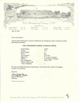 This Colt Government Model was shipped to the W.B. Jarvis Company in Grand Rapids, Michigan on June 4th, 1913 in a single gun shipment.