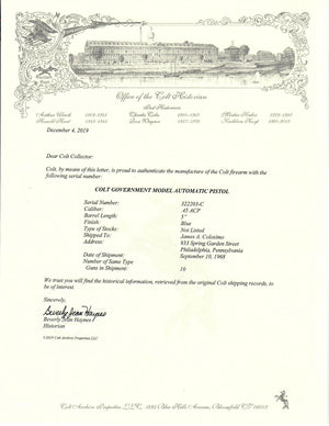 This Colt Government Model shipped to James A. Colosimo (Colosimo's Gun Center) at 933 Spring Garden Street in Philadelphia, Pennsylvania on September 10th, 1968 in a 10 gun shipment.