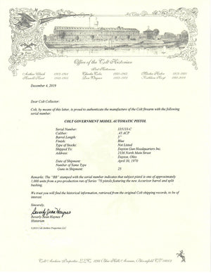 The Colt factory letter goes on to state in the Remarks: "The "BB" stamped with the serial number indicates that subject pistol is one of approximately 1,000 units from a pre-production run of Series '70 pistols featuring the new Accurizor barrel and split bushing."