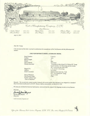 This Colt Government Model was Shipped to J.M and M.S. Browning of Ogden, Utah For: Col. Richard W. Young on April 9th, 1918. It was on Colt Factory order #891 on a Single gun shipment. The letter also states the pistol is Factory Inscribed: "Presented to their friend Col. Richard W. Young by the inventory J.M. Browning and his brother MS" on the left side of the slide. Note the roll mark of the rampant colt and patent dates is applied to the right side and has pushed the "COLT AUTOMATIC CALIBRE 45" further forward towards the front of the slide.