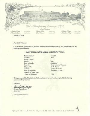 This Colt Government Model was ordered by the Government of Canada and shipped to H.W. Brown in Quebec, Canada on November 14th, 1914 in a 1,000 gun shipment.