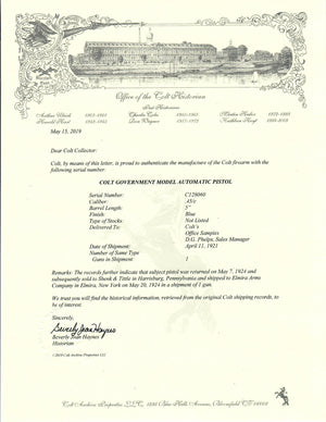 This Colt Government Model was Delivered to D.G. Phelps who was the Sales Manager at the Colt Manufacturing Company on April 11th, 1921 in a single gun shipment. The factory letter states that the records further indicate that subject pistol was returned on May 7th, 1924 and subsequently sold to Shenk & Tittle in Harrisburg, Pennsylvania and shipped to Elmira Arms Company in Elmira, New York on May 20th, 1924 in a shipment of 1 gun.