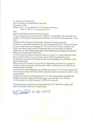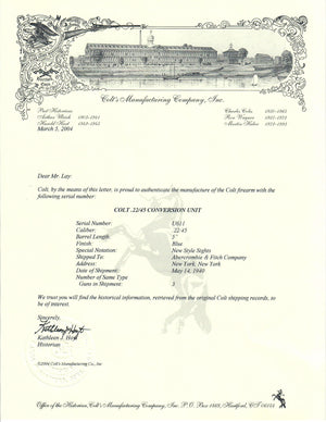 When the pistol arrived at Abercrombie & Fitch's store it was put together with Colt Conversion Unit U611 and sold together as a set to Dr. Gifford C. Ewing. Included in the case along with the Government Model and Conversion Unit is a bottle of Abercrombie & Fitch Genuine Rangoon Oil, Gun Cleaning Patches, Hoppe's 9 Powder Solvent, cleaning brushes and cleaning rods.