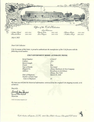 This Colt was shipped March 18th, 1948 to the Albany Hardware & Iron Company located at Brodway at Arch Street in Albany, New York. It was part of a 10 gun shipment.
