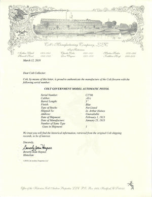 This Colt Government Model was shipped February 1st, 1913 to Lt. Arthur Haines in a single gun shipment. The address of the shipment is unknown and it also notes a Manufacture date of January 25th, 1913. This particular government model was built from one of the rare "Rejected Receivers".