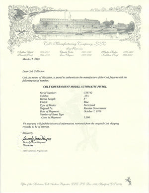 This Colt Government Model was shipped to the Russian Government on October 7th, 1916 in a 5,000 gun shipment. In total the Imperial Russian Government would purchase some 51,000 commercial Government Models from Colt From Feb 19th, 1916 through January 18th, 1917.