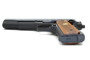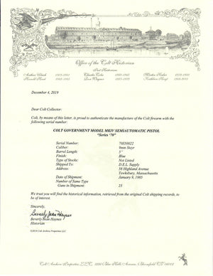 This Colt Series 70 Government Model was produced in 1985. It has a blue finish, factory checkered walnut grips and is chambered in the 9mm Steyr. It was shipped to D.E.L. Supply at 58 Highland Avenue, Tewksbury, Massachusetts on January 9th, 1985 in a 25 gun shipment.