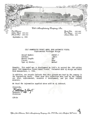 This Colt Hammerless Experimental Prototype .380ACP was a toolroom example and was estimated to be manufactured according to the letter ~1946. The factory records indicate that this firearm was kept by the Colt company in the Engineering Vault. As of this writing it's unsure how this particular pistol made it out or exactly when.