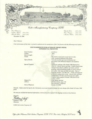 The factory letter reads: "Significant redesign of the Model 1908 Hammerless Model M. Shorter barrel and slide. Profile of grip frame changed noticeably by addition of contour on front grip strap, altered back trap profile, as well as altered grip safety, slide stop and slide lock safety. Base of magazine marked "Cal.380.Colt" Frame and magazine of altered configuration at butt. Altered slide, prototype configuration with blue still fixed and open sights. Compared with modified M Model 1908 pistol serial Number 1378?7. Subject pistol kept by the Colt factory as an experimental prototype of a new design of the model M Pocket 1908 pistol.