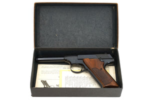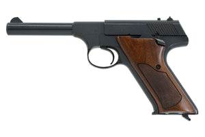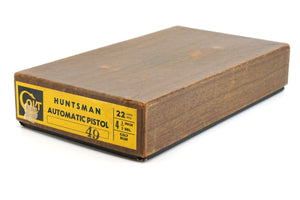 This 4.5" Colt Huntsman has a blue finish with factory walnut checkered grips. The front and rear sight are fixed as the Huntsman was a price sensitive pistol to try to compete with other less costly 22's that were on the market at the time.