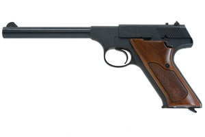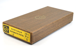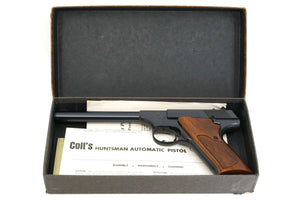 This 6" Colt Huntsman has a blue finish with factory walnut checkered grips. The front and rear sight are fixed as the Huntsman was a price sensitive pistol to try to compete with other less costly 22's that were on the market at the time.