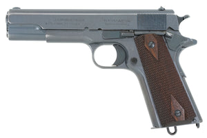 This M1911 is finished in Colt's fine brushed blue finish with dark blue small parts. The barrel is marked with a horizontal P and H visible through the ejection port. This practice of marking barrels like this took place approximately from serial number 22,500 to 120,000.