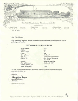This Colt M1911 was shipped to the Brooklyn Naval Yard on October 25th, 1912. This pistol retains it's factory original blue finish with 15 rows of checkering on it's walnut grips.