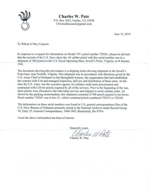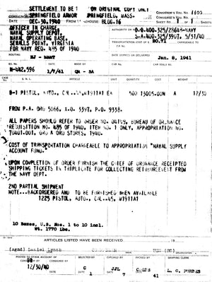 This Colt M1911A1 was shipped to the U.S. Naval Operating Base, Sewell's Point, Virginia, on January 8th, 1941.