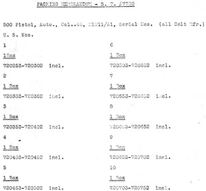 The document showing this provenance is a shipping ticket showing the shipment from the Colt factory to the Sewell's Point base, near Norfolk, VA.  This shipment was in accordance with directions given to Colt by the Springfield Armory, the organization that had established the contract with Colt and managed inspection, delivery and distribution of these arms.  At the time the U.S. Army was the executive agency for military small arms procurement and contracted with Colt for pistols required by all of the services.  Prior to the beginning of the war, these pistols were allocated to the individual services and shipped in serial number order.  As shown by the packing memorandum, this shipment consisted of 500 pistols packed in ten boxes.  Pistol number 720261 was in box #1 which contained pistols numbered 720253-720302.