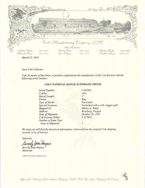 This fixed sight Colt National Match was shipped to Shirley A. Baker of Roseburg, Oregon on October 28th, 1932 in a single gun shipment.