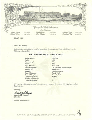 This Colt National Match was shipped to Simon Atlas in Washington D.C. on July 2nd, 1936. The letter shows the date of Manufacture was June 11th, 1936 and was shipped in a single gun shipment. The letter mentions Factory Engraved: "M.J. Schaub" on the receiver.