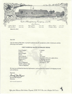 This Colt National Match was shipped December 8th, 1937 to J. Warshal and Sons of Seattle Washington in a 2 gun shipment.