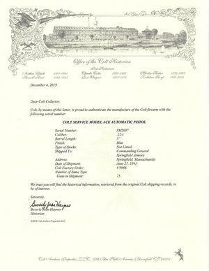 This Colt Service Model Ace shipped to the Commanding General at Springfield Armory in Springfield, Massachusetts on June 27th, 1941 in a 75 gun shipment. It was on Colt Factory Order #9966.