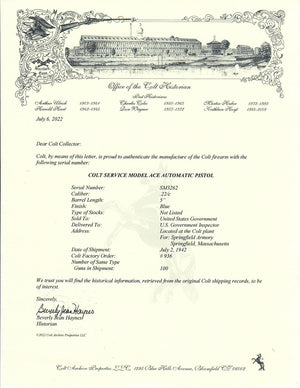 It was Delivered to the U.S. Government Inspector Located at the Colt Plant. It was for Springfield Armoy of Springfield Massachusetts. The date of shipment was July 2nd, 1942. It was on Colt Factory Order Number 936 as part of a 100 gun shipment.