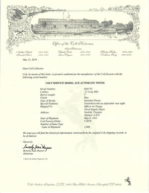 This Colt Service Model Ace was shipped May 8th, 1945 to the Officer in Charge at the Naval Supply Depot in Norfolk, Virginia. It was marked for "S.H.P." which is believed to be at a specific building or group at the Naval Depot. The thought is that it would help in routing the freight to correct warehouse where they needed it.