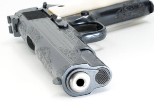 The factory engraving on this particular pistol is pretty extensive. Coverage area's also extend to the front strap, grip safety, barrel bushing and trigger guard.