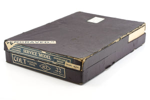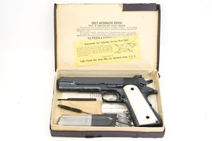 Accompanying this pistol is the original maroon Colt box. Included in the box is the cleaning brush, instruction sheet, spare magazine and screwdriver. The end label of the box has a "pearl blue" label as well as an "Engraved" label.