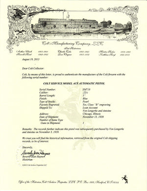 This Colt Service Model Ace was shipped November 15th, 1938 to Von Lengerke and Antoine of Chicago, Illinois. It was on a "loan account" and was eventually purchased on November 3rd, 1939. Normally pistols such as this were on display in the store to showcase Colt's capabilities in custom ordering options.