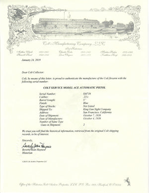 This Colt Service Model Ace was shipped to the King Gun Sight Company of San Francisco, California on October 7th, 1938 in a 2 gun shipment. The letter states the pistol was manufactured 3 days prior on October 4th, 1938.