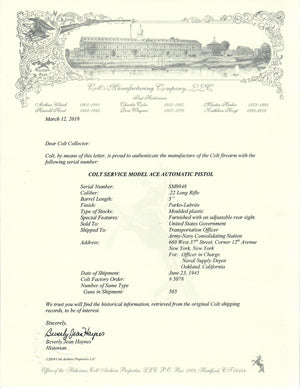 This Colt Service Model Ace was shipped to the Transportation Officer of the Army-Navy Consolidating Station in New York, New York. The factory letter states it was marked for the Officer in Charge at the Naval Supply Depot of Oakland, California. This pistol was part of a 565 gun shipment on June 23rd, 1945.