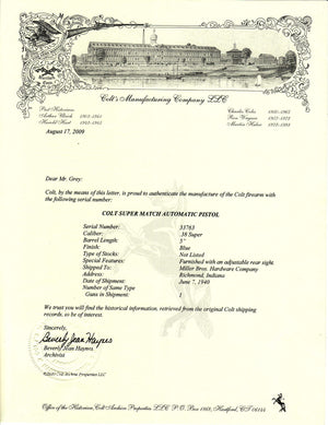 This Colt Super Match was shipped on June 7th, 1940 to the Miller Brothers Hardware Company of Richmond Indiana in a single gun shipment. It's finished in Colt's fine brushed blue finish with factory checkered walnut grips. The sights on this pistol are adjustable as this was the standard option when purchasing a Colt Super Match.